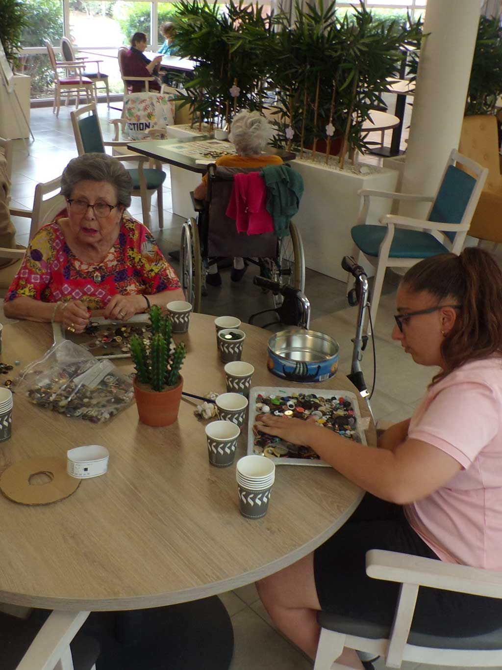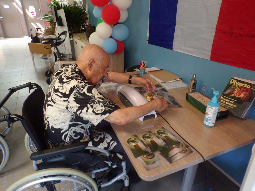 Dans une ambiance sérieuse mais laissant la place aux anecdotes et à la bonne humeur les résidents des Amaryllis, collent, découpent, plastifient, colorient et participent activement aux ateliers créatifs sous le regard bienveillant de notre animatrice Isabelle.